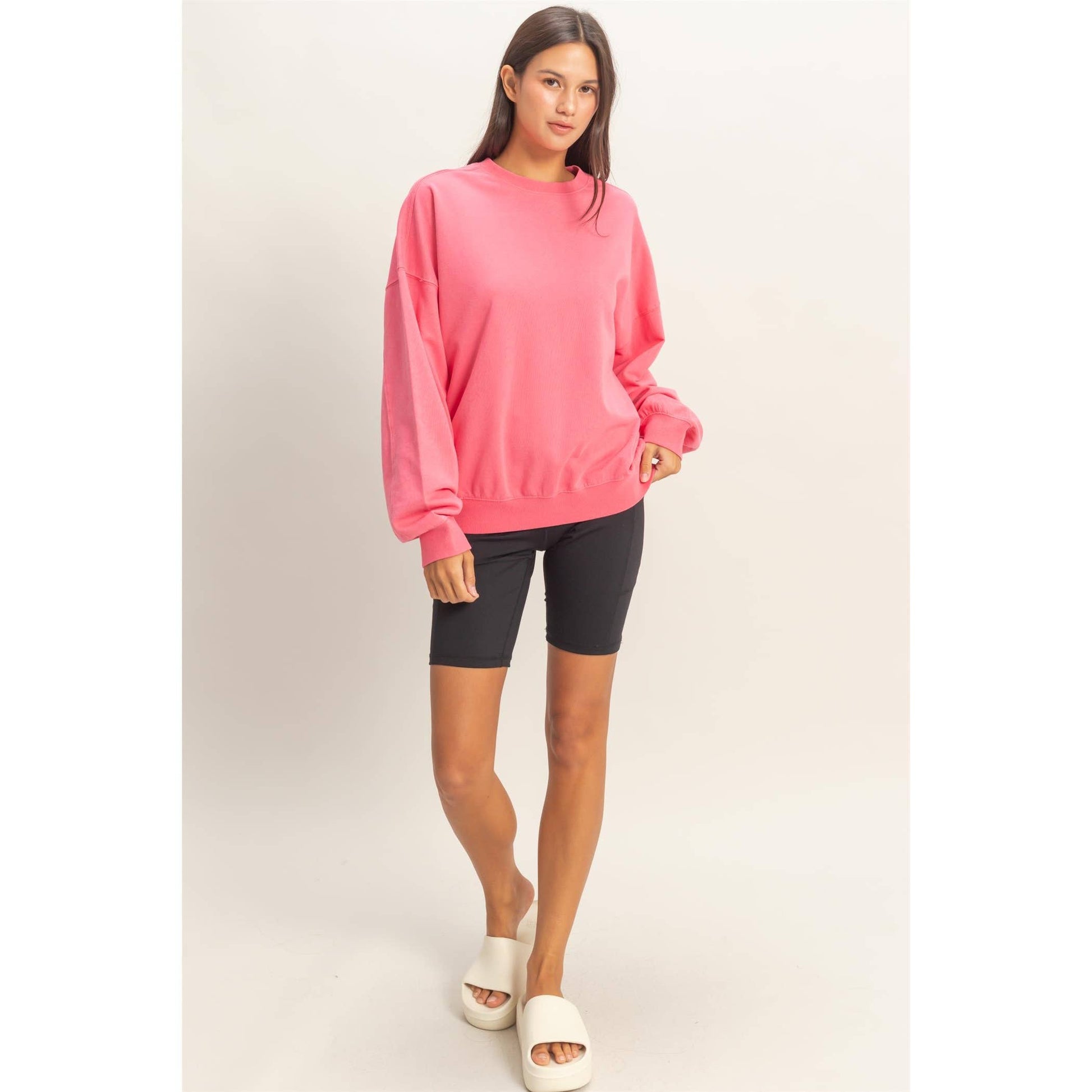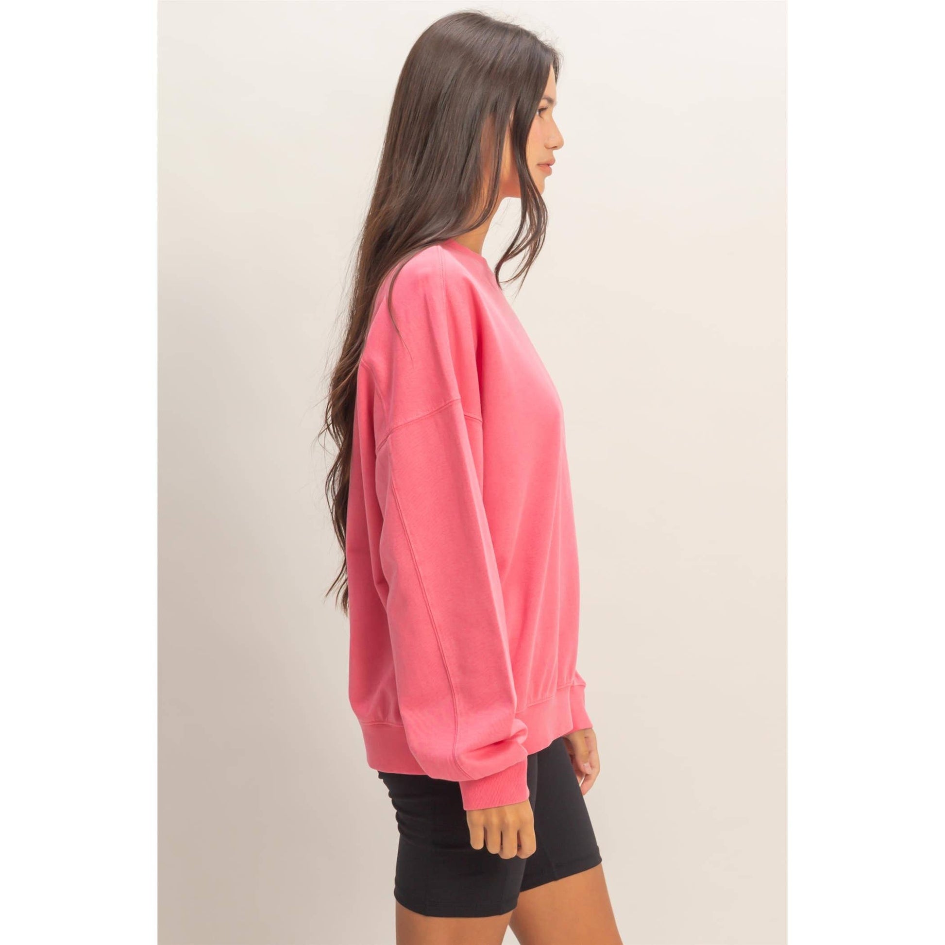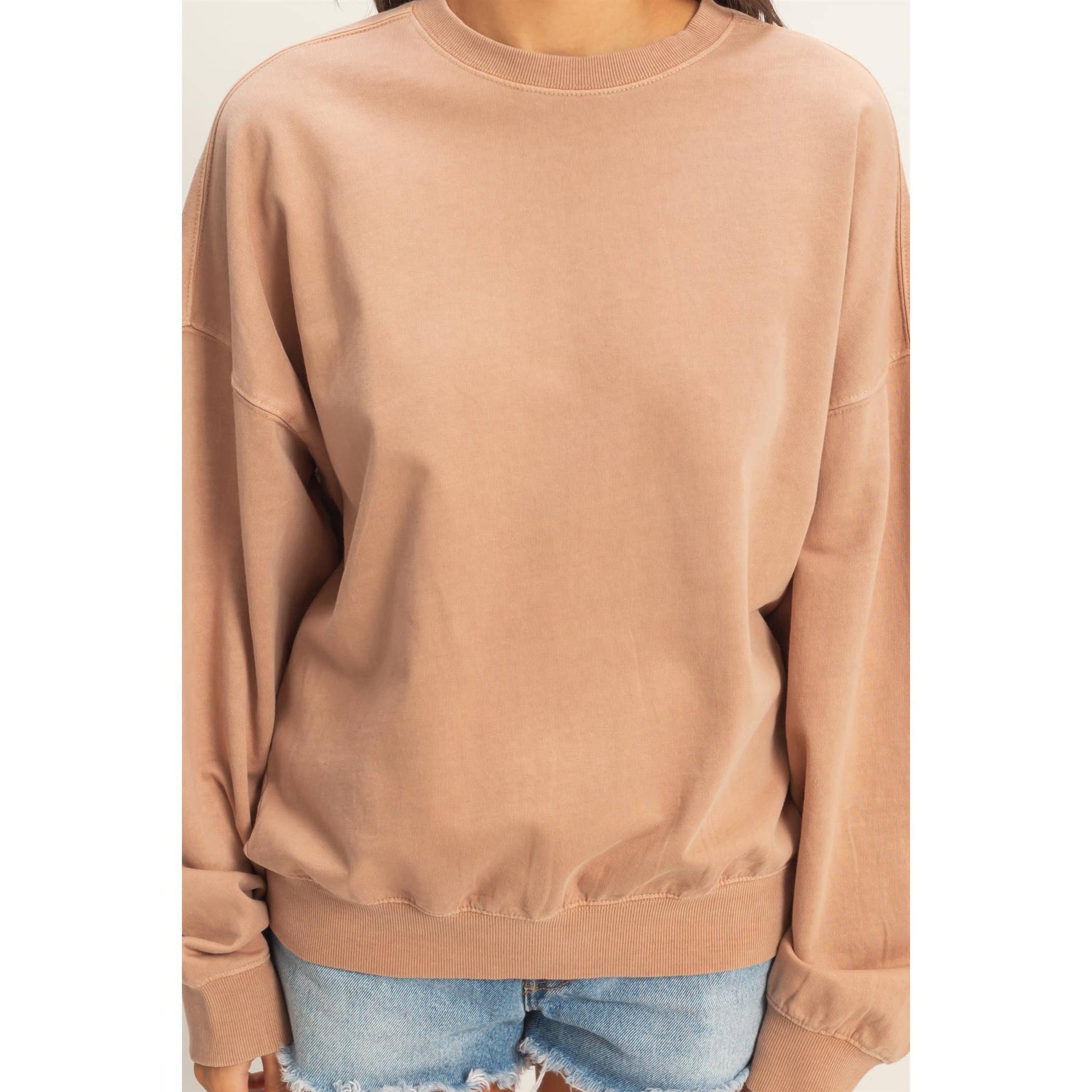 This essential sweatshirt is crafted from a soft cotton blend, pigment dyed and stonewashed for a faded texture. The design includes as ribbed crew neckline, dropped shoulders, wiht full long sleeves and ribbed cuffs. It is cut in a generous oversized, relaxed fit. Pair this top with high-waisted jeans and sneakers for a laid-back vibe.