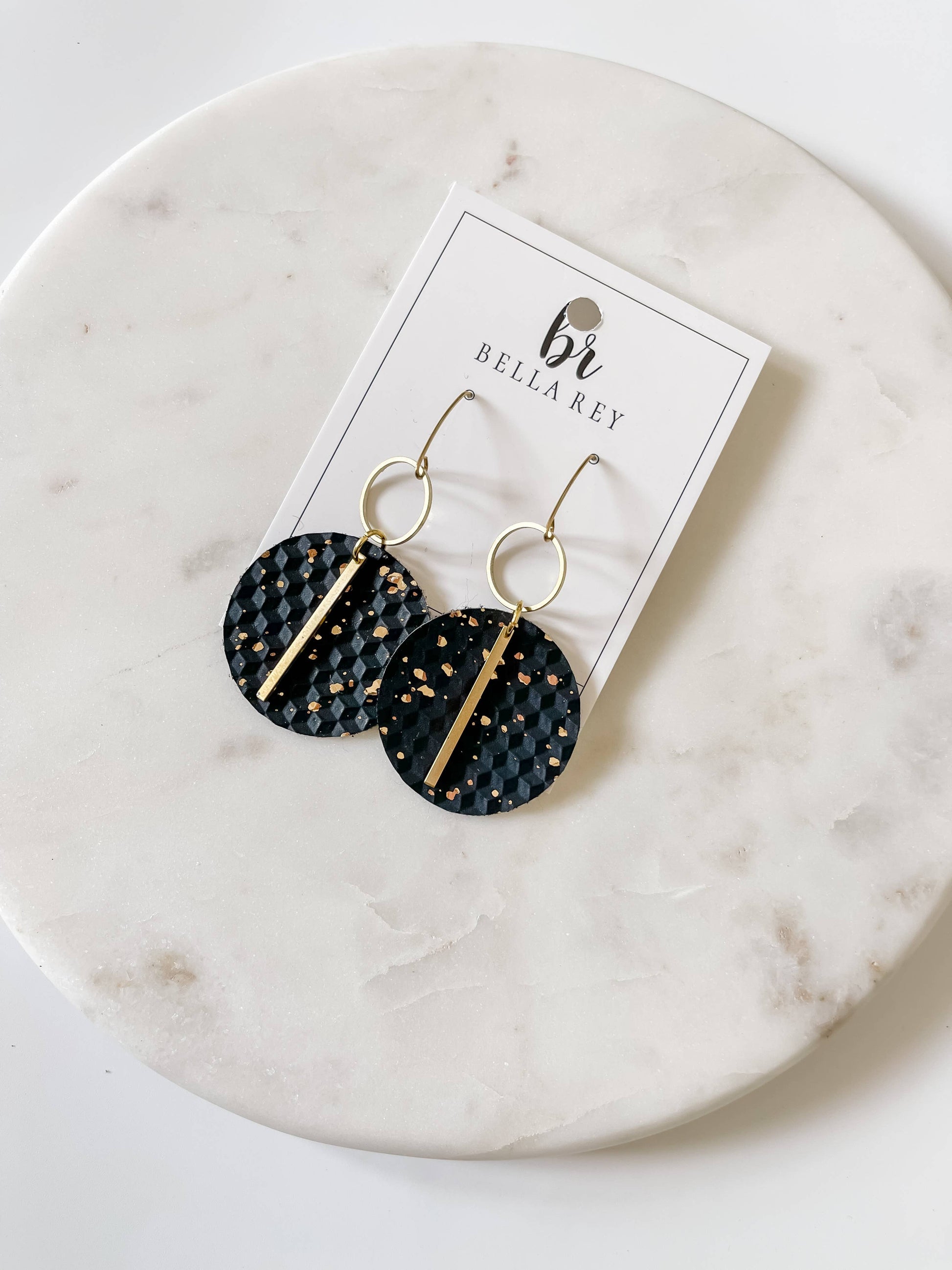 Discover the Harper, a pair of black/gold flecked dangle earrings from Bella Rey Jewelry. This design reflects our commitment to lightweight, quality earrings at an excellent price point. Ideal for any setting, from the board room to the ball field, you'll forget you're even wearing them. Enjoy the blend of minimalist design and unique detailing that makes these earrings stand out. Perfect for personal wear or as a gift, these earrings represent the passion and creativity Bella Rey Jewelry pours into each piece.